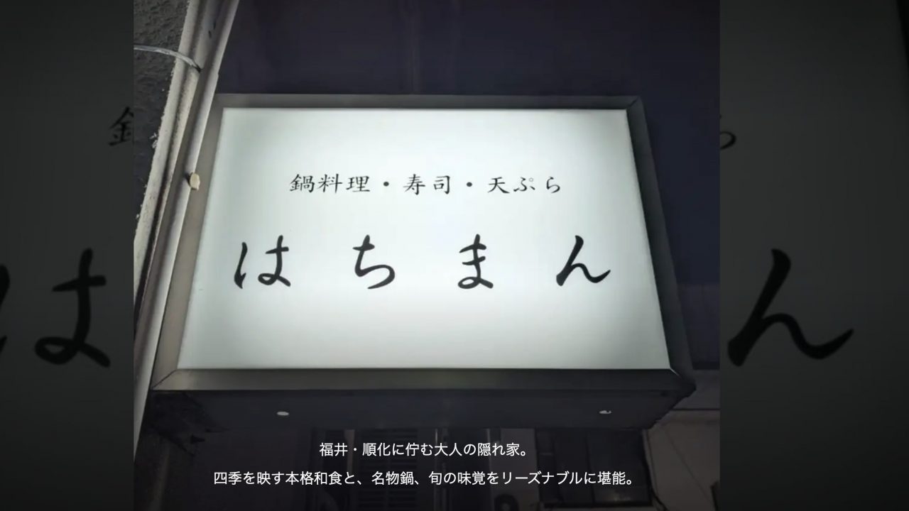福井で和食店をお探しなら、仁愛女子高校駅から徒歩7分の「はちまん」にお越しください。