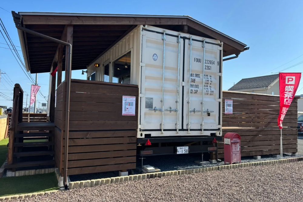 よりみち喫茶 花きりんは、海上コンテナを活用したユニークな外観と、木材の温もりに包まれた和の空間が融合したカフェです。